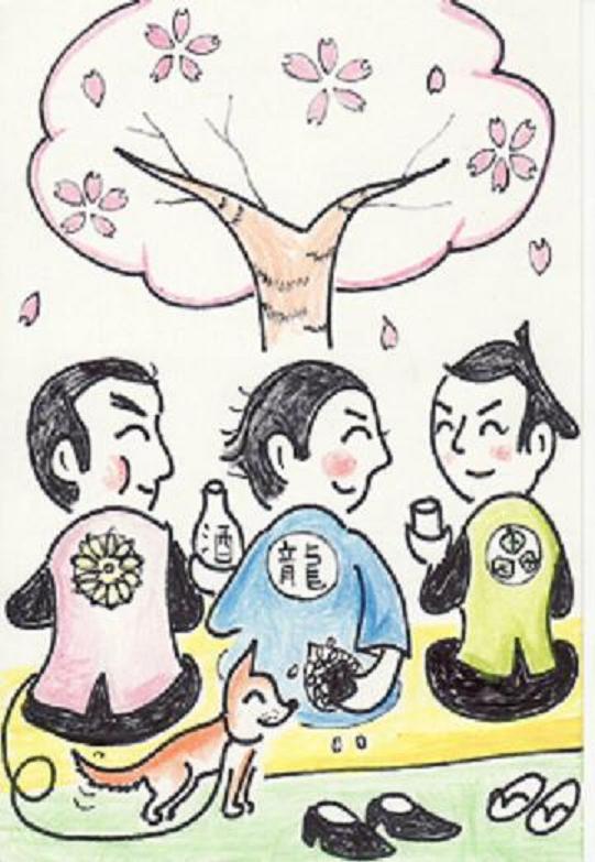 満開の桜の木の下、頻りに盃を交わす三人組。この姿は一体いつの頃の情景なのだろうか。